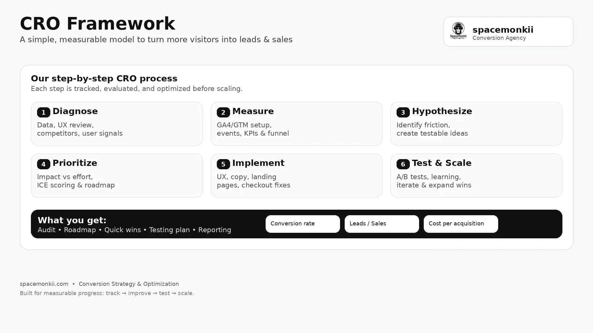 Spacemonkii is a conversion agency that turns traffic into revenue through a practical, step-by-step conversion strategy. We start with a free, no-obligation analysis of your online presence and competitors, then map a clear conversion journey and priorities that fit your budget. Execution can include tracking (GA/GTM), UX/CRO improvements, landing pages and content, lead generation, Google Ads, SEO, and ongoing webshop/website support. Each step is measured and evaluated before moving to the next—so you get transparency, fast learning, and scalable growth.